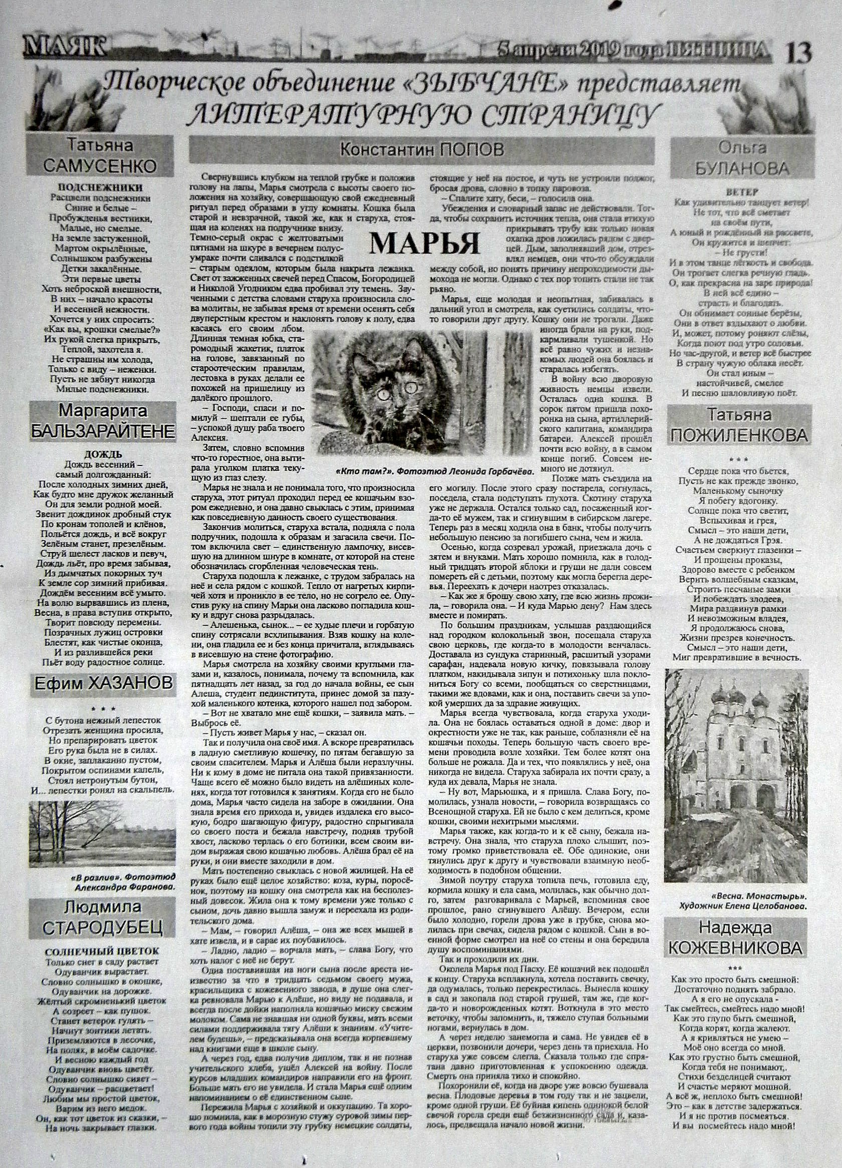 5 апреля опубликован новый выпуск печатного органа творческого объединения «Зыбчане» – литературной страницы в газете «Маяк». Почти все литературные и художественные материалы членов клуба приурочены к нынешнему времени года – весне. Здесь можно прочитать стихотворения Татьяны Самусенко, Маргариты Бальзарайтене, Людмилы Стародубец, Ольги Булановой, Татьяны Пожиленковой, Надежды Кожевниковой, а также нашего земляка из Самары Ефима Хазанова, недавно отметившего свой юбилей. Новый рассказ представил Константин Попов. Иллюстрирована полоса фотоработами Леонида Горбачёва и Александра Фаранова, репродукцией картины Елены Целобановой.