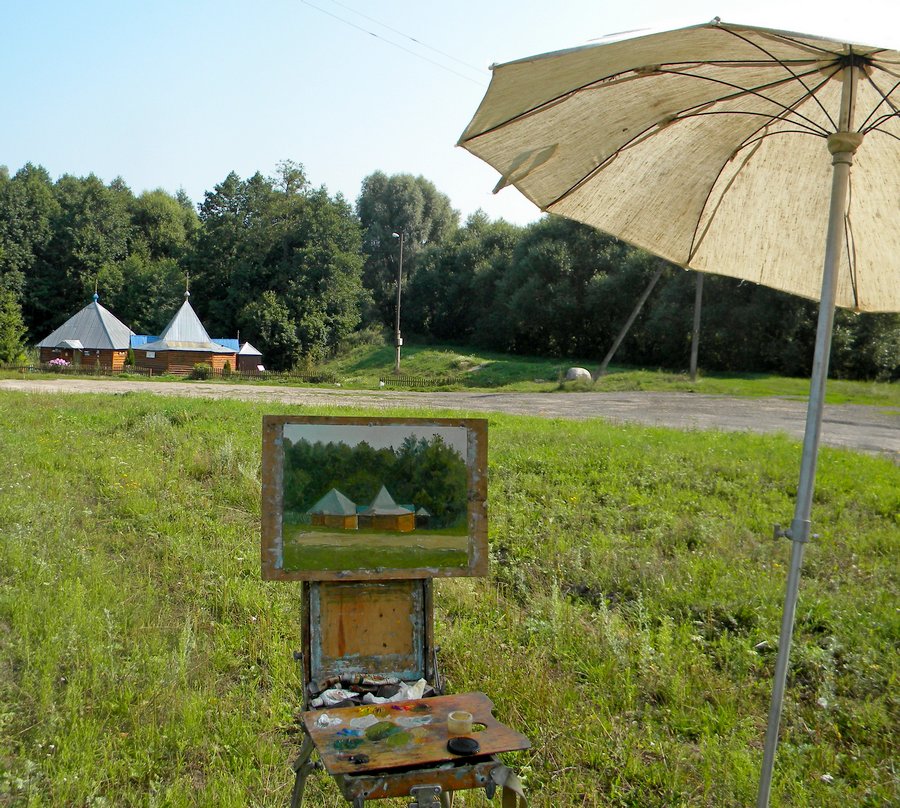 Погода в этот день явно благоприятствовала и, когда доехали до места, стояла тихая и нежаркая утренняя пора. Во всяком случае до полдня, когда всё же солнце стало значительно припекать, а вереницы автомобилей потянулись к источнику и купальне, успели свои работы закончить. Конечно, чтобы охватить все натурные сюжеты села и его окрестностей требуется больше времени, поэтому решили ограничиться поляной, на которой проводятся мероприятия поэтического праздника и видами известной на все окрестности криницы.