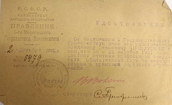 Удостоверение о работе Чарнолуского профессором 1-го МГУ