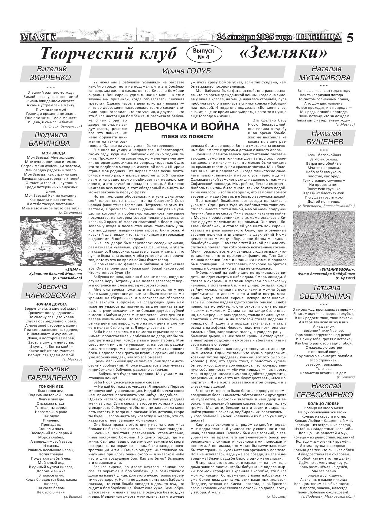 В газете “Маяк” от 24 января 2025 г. вышел четвертый номер литературно-художественной страницы “Творческий клуб “Земляки”. Он продолжает литературный проект редакции городской газеты, знакомящий читателей с творчеством наших земляков, малой родиной которых является Новозыбковский округ.