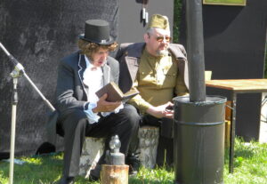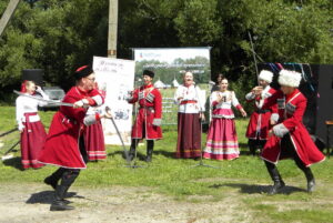 В исполнении наших театралов, бывшего режиссера народного театра Андрея Кочетова и актера НДТ Олега Юрченко прошла инсценировка известного стихотворения Ильи Швеца “Встреча”, в котором автор-воин ведет диалог с А.С. Пушкиным. Порадовал пришедших на праздник зрителей и казачий ансамбль из Брянска “Русь молодая”. В их исполнении в течение всего праздника звучали песни, исполнялись танцы, демонстрировалось жонглирование с саблями.