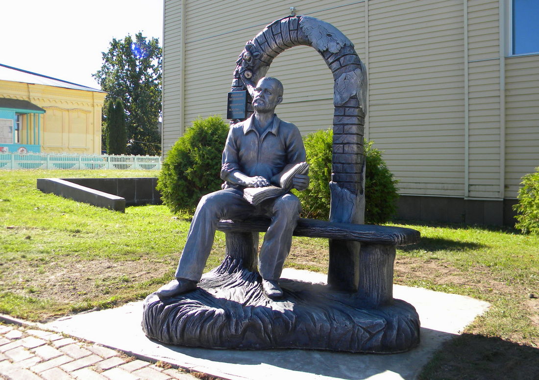 Автором памятника стала злынковский скульптор Наталья Гонт, изобразившая поэта сидящим на скамье с книгой в руках. Выполнена скульптура из артбетона. А вот главным инициатором его установки проявила себя руководитель автономной некоммерческой организации (АНО) “Дорога Добра” г. Злынка Светлана Графа. Именно она убедила, вдохновила, организовала сбор средств вместе с местной администрацией. А когда их не хватило, вложила в создание памятника часть собственных сбережений.