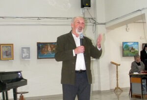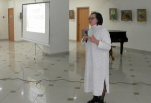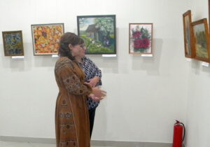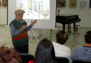 Куратор выставки, заведующая отделом обслуживания библиотеки Елена Гусенок рассказала об авторах и экспонатах выставки, названной организаторами “Новозыбковская палитра”. На экране состоялась презентация исторических фотографий прошлых групповых экспозиций, публикаций о делах художников, истории клуба “Зыбчане” в его эволюции – клуб, творческое объединение, товарищество художников. В нынешнем самостоятельном статусе сообщество существует с марта нынешнего года, хотя состав участников практически остался прежним – художники всегда были составной частью “Зыбчан”. Елена Васильевна предоставила слово старейшим участникам выставки – Лидии Бондаренко, бывшему директору Новозыбковской ДХШ и Константину Попову, нынешнему руководителю товарищества.