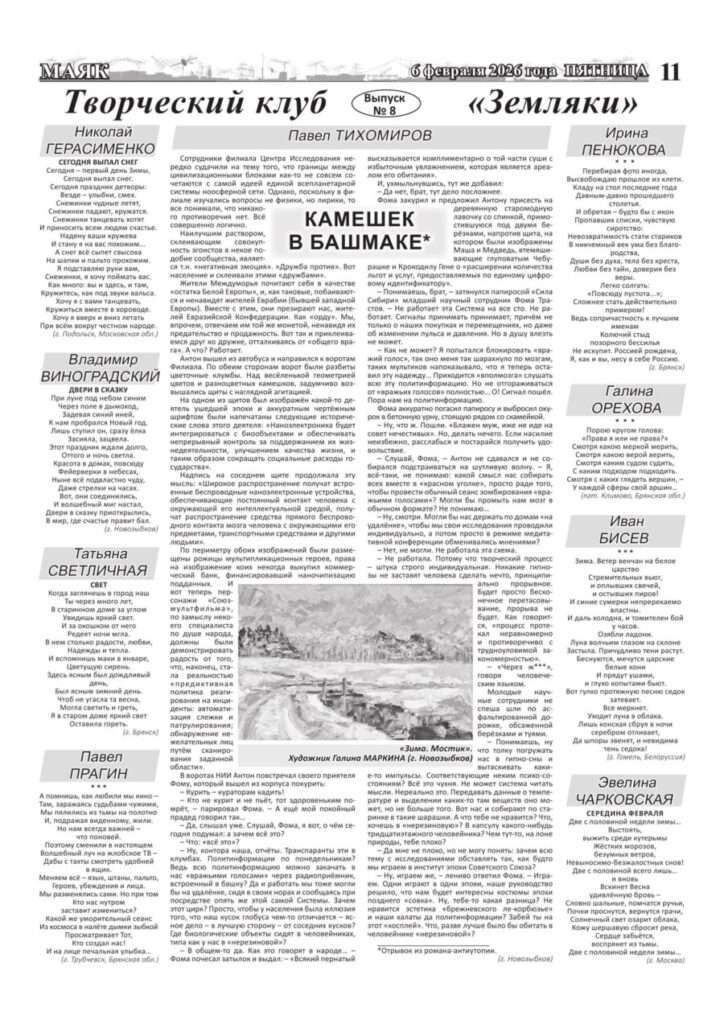 В газете “Маяк” от 6 февраля 2026 г. опубликована литературно-художественная страница “Творческий клуб “Земляки” (восьмой выпуск). Страница публикует в основном произведения наших земляков, живущих за пределами городского округа. Представлены отрывок из романа-антиутопии Павла Тихомирова (г. Новозыбков)., стихотворения: Николая Герасименко (г. Подольск, Московская обл.), Ирины Пенюковой и Татьяны Светличной (обе г. Брянск), Владимира Виноградского (г. Новозыбков), Галины Ореховой (пгт. Климово, Брянская обл), Ивана Бисева (г. Гомель, Белоруссия), Павла Прагина (г. Трубчевск, брянская обл.), Эвелины Чарковской (г. Москва). Иллюстрирована страница картиной Галины Маркиной (г. Новозыбков)