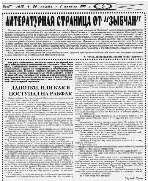 Первая коллективная публикация литературной секции клуба «Зыбчане» на страницах новой городской газеты (частное издание, выходило с 1998 г.). Включает вступительное слово председателя совета клуба К.Попова, документальный рассказ-воспоминание Сергея Лузика, стихотворения М.Воликова, В.Кухаришина, М.Владимирского, А.Вагабова, Е.Мосягина, В.Валентиновой, А.Краевого.